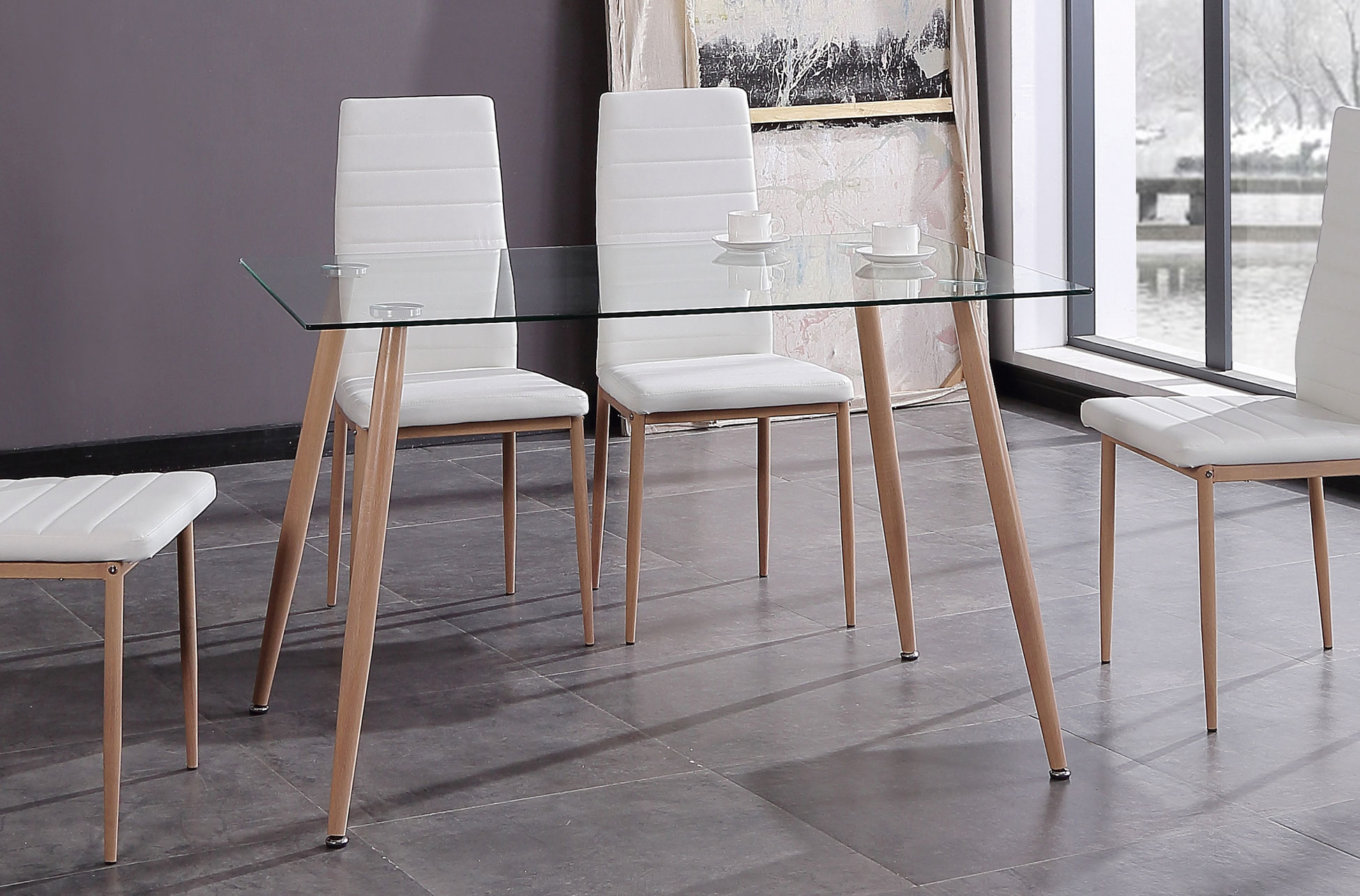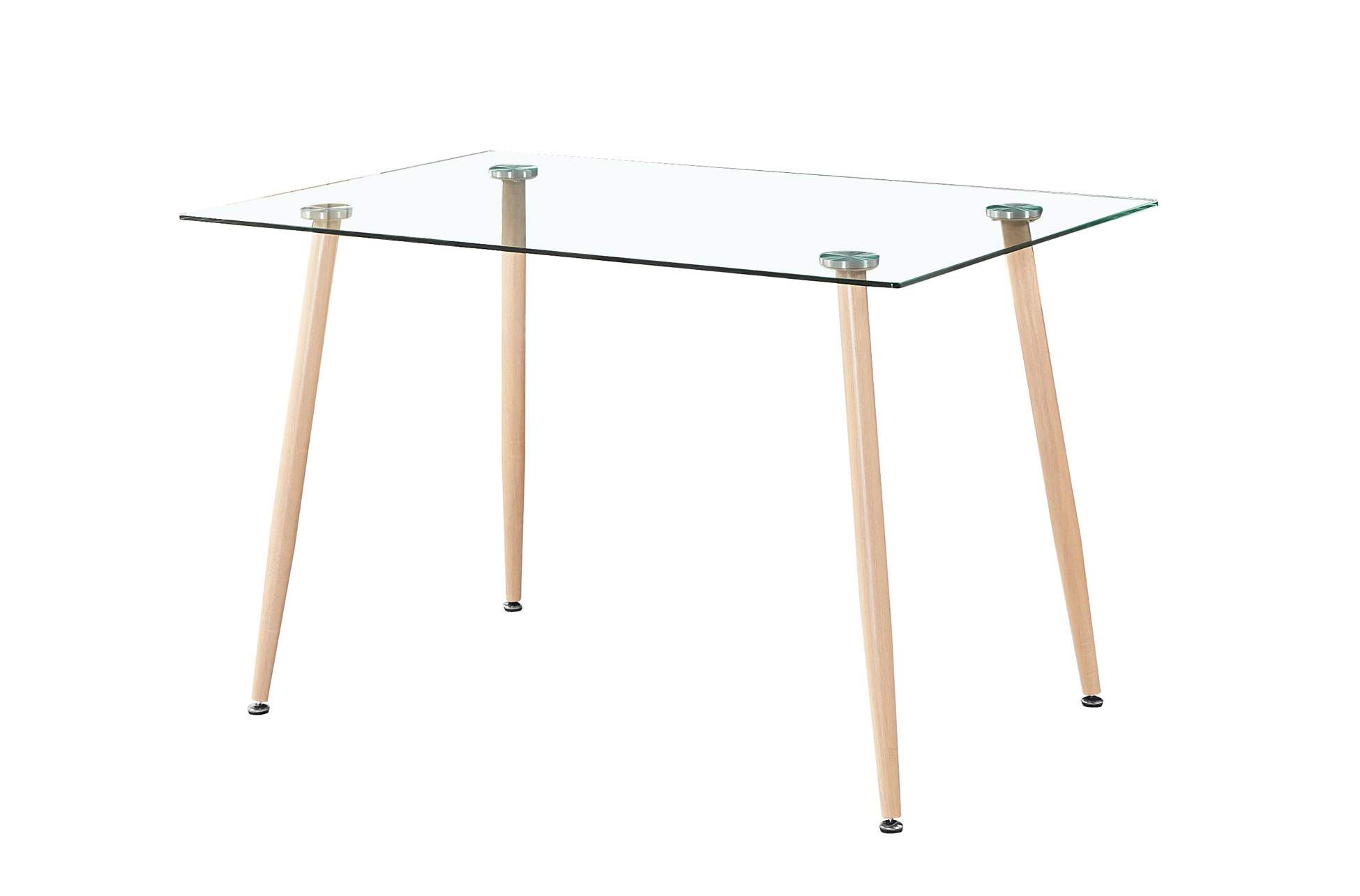 – Cristal templado transparente. – Patas metálicas imitación madera.