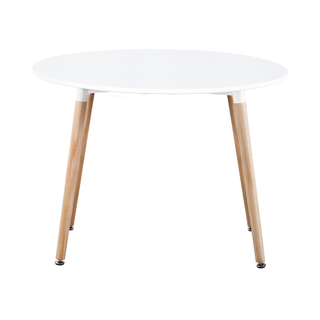 Mesa redonda modelo CRETA, con patas de madera de haya, disponible en blanco o gris.